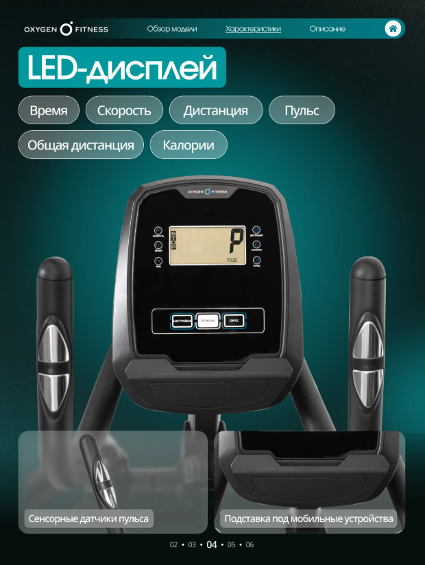 OXYGEN FITNESS ALAMOSA — надёжный эллиптический тренажёр для домашних тренировок, ориентированный на пользователей, которым важны плавность хода, сбалансированная нагрузка и комфорт суставов. Передний привод, продуманная эргономика и магнитная система нагружения делают ALAMOSA отличным выбором для регулярных кардиотренировок, направленных на развитие выносливости и укрепление всего тела. Тренажёр построен на высокопрочной раме с антикоррозийной обработкой и двухслойной покраской, что обеспечивает устойчивость и долговечность конструкции. Корпус выполнен из ударопрочного полистирола HIPS, устойчивого к износу. Передний привод и инерционный вес маховика24 кг(BioFusion™) обеспечивают ровное, стабильное и естественное движение без рывков. Реальный вес маховика составляет6 кг. Длина шага460 ммподходит для большинства пользователей и позволяет поддерживать комфортную амплитуду движения. Расстояние между педалями — всего80 мм, что снижает нагрузку на колени и тазобедренные суставы. Педальный узел с трёхкомпонентным шатуном повышает надёжность и ресурс тренажёра, а увеличенные антискользящие педали обеспечивают уверенную фиксацию стопы. ALAMOSA использует магнитную систему нагружения с 10 уровнями сопротивления, регулируемыми механически. Это позволяет легко подобрать интенсивность тренировки — от лёгкой кардионагрузки до более энергичных занятий. Тренажёр не требует подключения к электросети, что упрощает установку и эксплуатацию в домашних условиях. Консоль оснащена монохромным LED-дисплеем и отображает основные параметры тренировки: • время, • скорость, • дистанция, • калории, • пульс, • общую дистанцию. Доступные режимы: быстрый старт и ручной режим. Интерфейс поддерживает русский и английский языки. Для контроля сердечного ритма предусмотрены сенсорные датчики пульса на поручнях. Рукоятки двухпозиционные, с нескользящим покрытием.