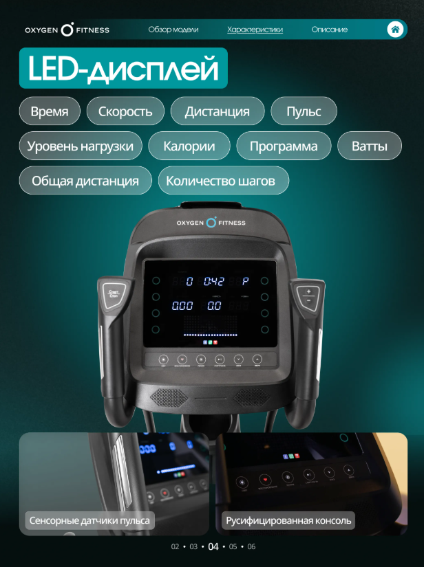 OXYGEN FITNESS MINT — продвинутый эллиптический тренажёр для домашних тренировок, ориентированный на пользователей, которые хотят получить клубный уровень нагрузки и биомеханики у себя дома. Модель сочетает длинный шаг, минимальное расстояние между педалями, электромагнитную систему нагружения и расширенный программный функционал, обеспечивая эффективные и безопасные кардиотренировки для всего тела. Тренажёр построен на массивной высокопрочной раме с антикоррозийной обработкой и двухслойной покраской, что гарантирует устойчивость и долгий срок службы. Корпус выполнен из ударопрочного полистирола HIPS, устойчивого к износу и механическим нагрузкам. Ключевые параметры движения: • Инерционный вес маховика30 кг(BioFusion™) при реальном весе10 кг— плавный, стабильный и тихий ход без рывков. • Длина шага540 мм— максимально естественная амплитуда, близкая к беговой, подходит пользователям разного роста. • Минимальное расстояние между педалями —60 мм, что значительно снижает нагрузку на колени и тазобедренные суставы. • Дисковый шатун — высокая надёжность и точность передачи усилия. • Ручная регулировка угла наклона (3 уровня) позволяет смещать акцент нагрузки и разнообразить тренировочный процесс. Увеличенные антискользящие педали обеспечивают устойчивое и безопасное положение стоп во время занятий. OXYGEN FITNESS MINT использует электромагнитную систему нагружения с 16 уровнями сопротивления, управляемыми электронно. Это обеспечивает точную настройку интенсивности тренировки — от восстановительных до высокоинтенсивных кардиосессий. Тренажёр оснащён LED-дисплеем, отображающим полный набор тренировочных показателей: • время, скорость, дистанция, • калории, пульс, уровень нагрузки, • программа, Ватты, количество шагов, • общая дистанция. Программный пакет включает 24 режима тренировки: • быстрый старт и ручной режим, • 12 предустановленных программ, • 4 пользовательские программы, • 4 пульсозависимые программы, • программа целевого пульса, • жироанализатор, • режим работы по Ваттам, • тест восстановления. Для контроля сердечного ритма предусмотрены сенсорные датчики на поручнях, а также возможность подключения Bluetooth-кардиодатчика (приобретается отдельно).