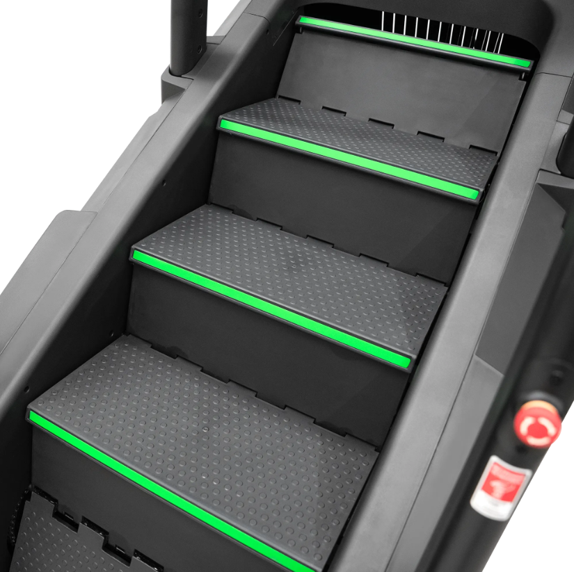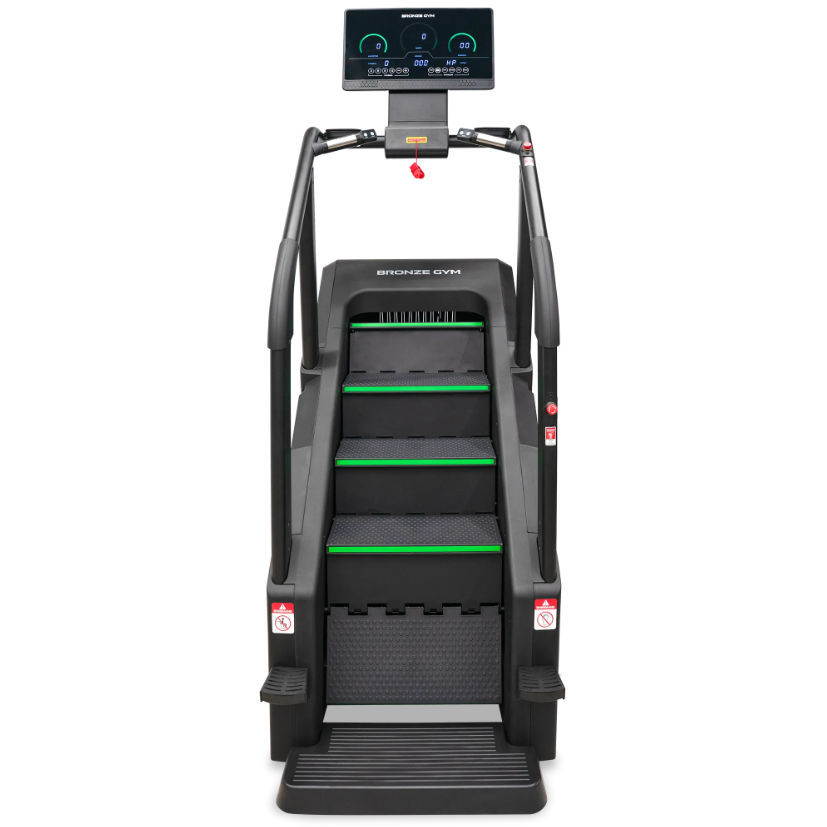 BRONZE GYM C1000M PRO TURBO — профессиональная лестница-эскалатор нового поколения для кардиозоны, где ценится надёжность, функциональность и комфорт. Модель создана с учётом высоких требований к оборудованию в залах с большой проходимостью. Усиленная конструкция, широкий диапазон скоростей, эргономичные поручни и нескользящие ступени обеспечивают уверенную и безопасную тренировку на всех уровнях подготовки. Инновационные технологии: Система EMS (электромагнитное сопротивление) для точного контроля нагрузки Современный LED-дисплей с интуитивным управлением Удобные рукоятки с кнопками быстрой регулировки Беспроводная зарядка для смартфона Расширенный функционал: 40 программ тренировок Контроль пульса, шагов, дистанции, калорий, уровня нагрузки 15 уровней интенсивности: от 14 до 160 шагов в минуту Угол наклона 35° (75%) Размер ступени: 500 × 260 ×183 мм3 активные ступени, 9 в общей конструкции Безопасность и удобство: Самоблокирующаяся тормозная система Отключение при отсутствии пользователя Система защиты при весе менее30 кг